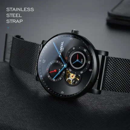 Die schwarze Variante mit strukturiertem Zifferblatt, sichtbarer Mechanik und dezent farbigen Akzenten wirkt modern und maskulin.