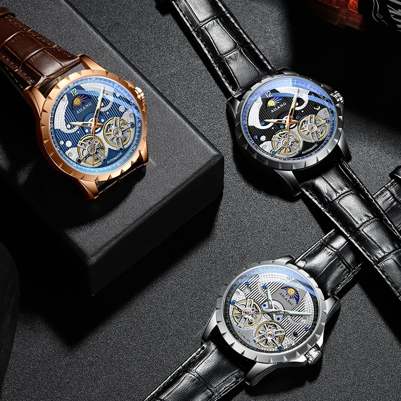 Automatische Herrenarmbanduhr mit offenem Zifferblatt, Tag-Nacht-Anzeige und Lederarmband für Business und Freizeit.