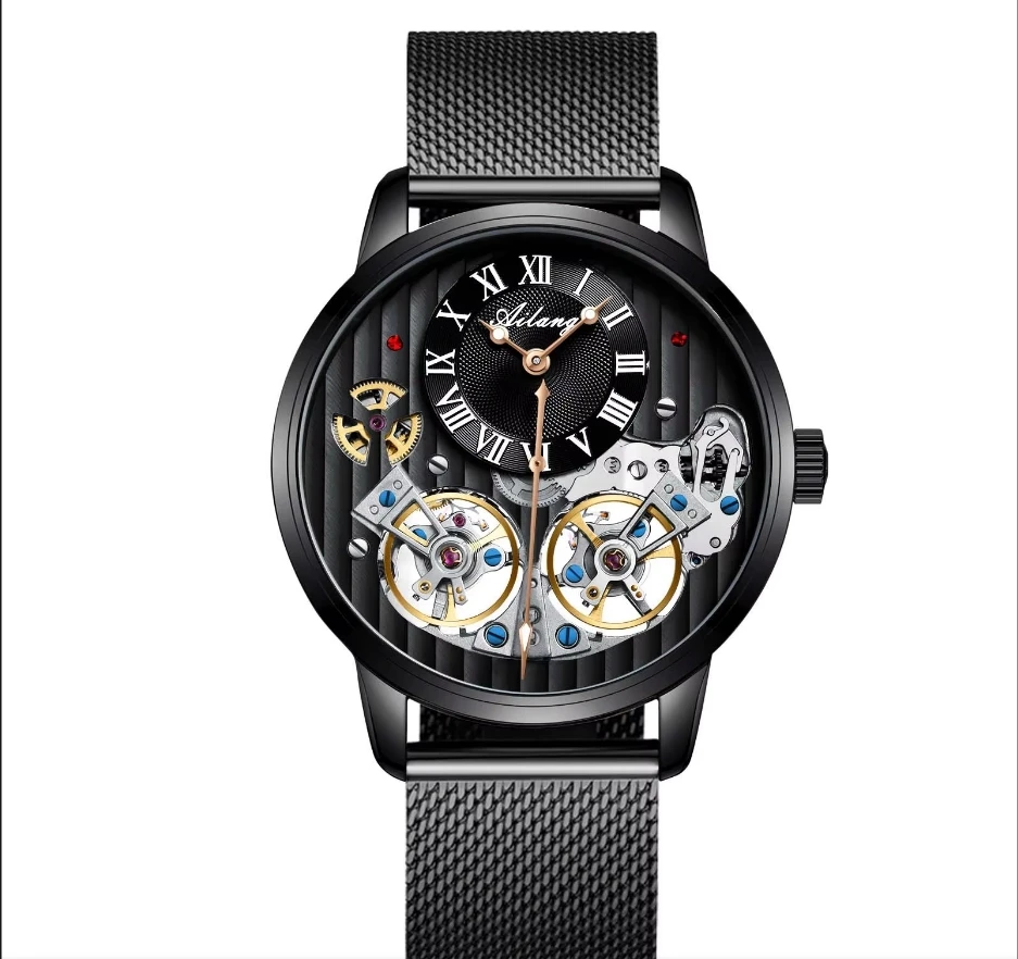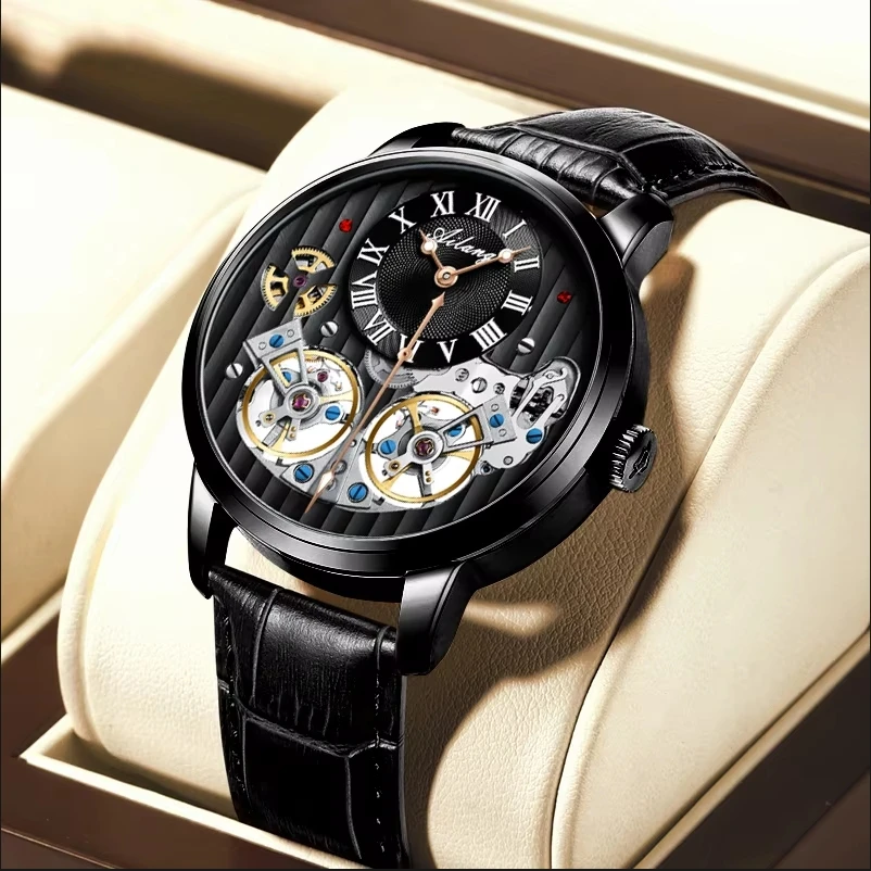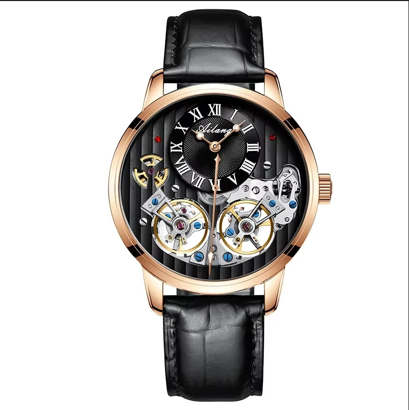 AILANG Herren Automatikuhren Skelett Lederarmband 42 mm Roségold