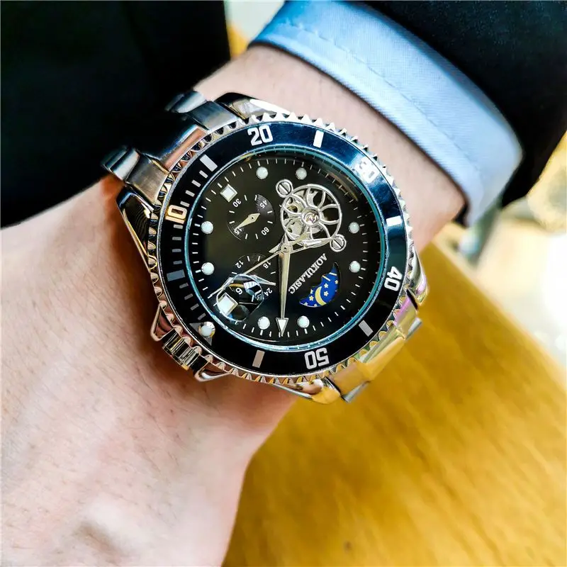 AOKULASIC Automatik Herrenuhr Skelett Mondphase 43mm Edelstahl wasserabweisend