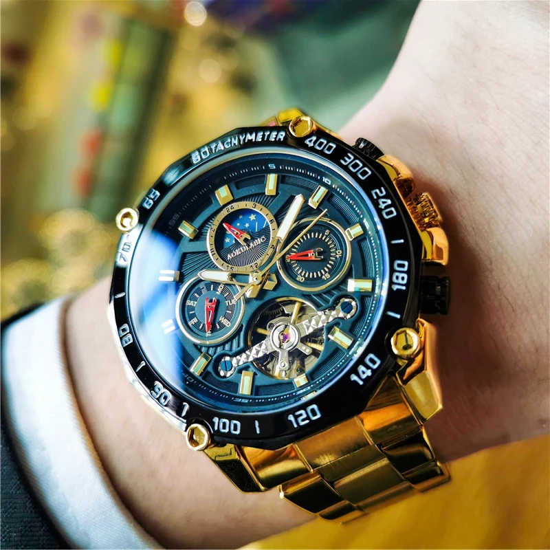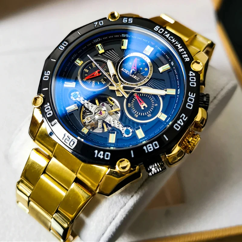 AOKULASIC Herrenuhr Automatikuhr Skelett Mondphase Chronograph Edelstahl