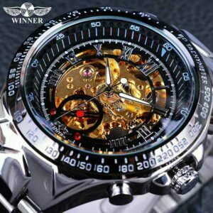 Luxuriöse Edelstahl-Uhr mit Skelett-Zifferblatt, goldenem Uhrwerk und automatischem Aufzug