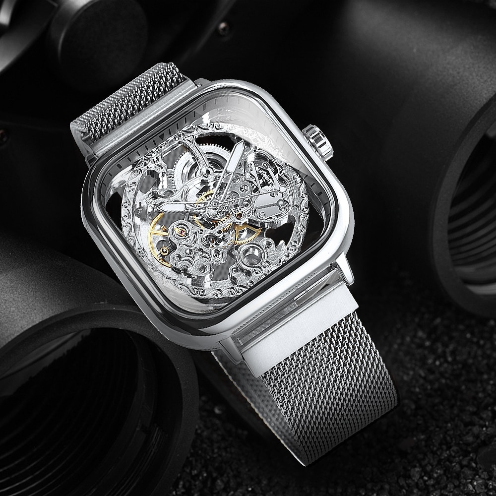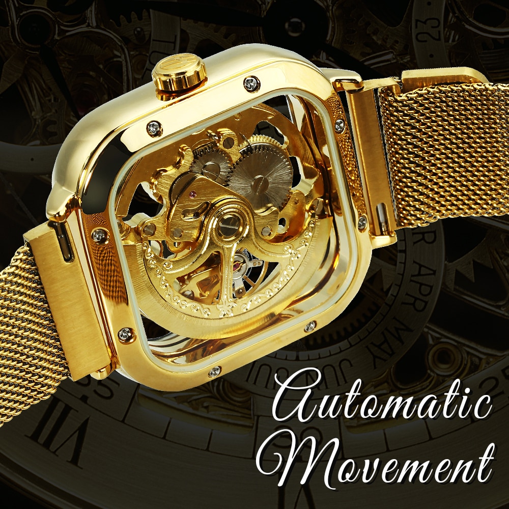 Luxuriöse Edelstahl-Uhr mit Skelett-Zifferblatt, goldenem Uhrwerk und automatischem Aufzug