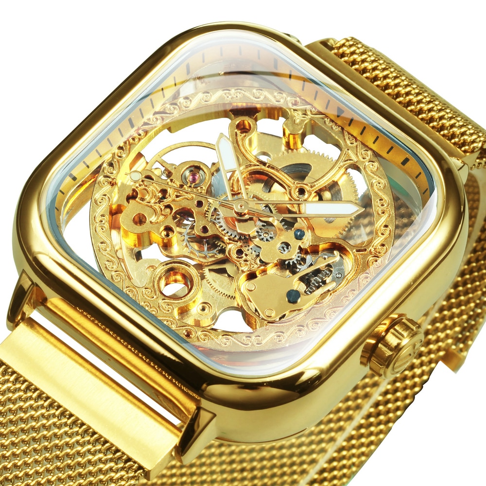 Armbanduhr Uhren Herren Automatische Mechanische Uhr Gold Transparent Mesh Stahl Skelett