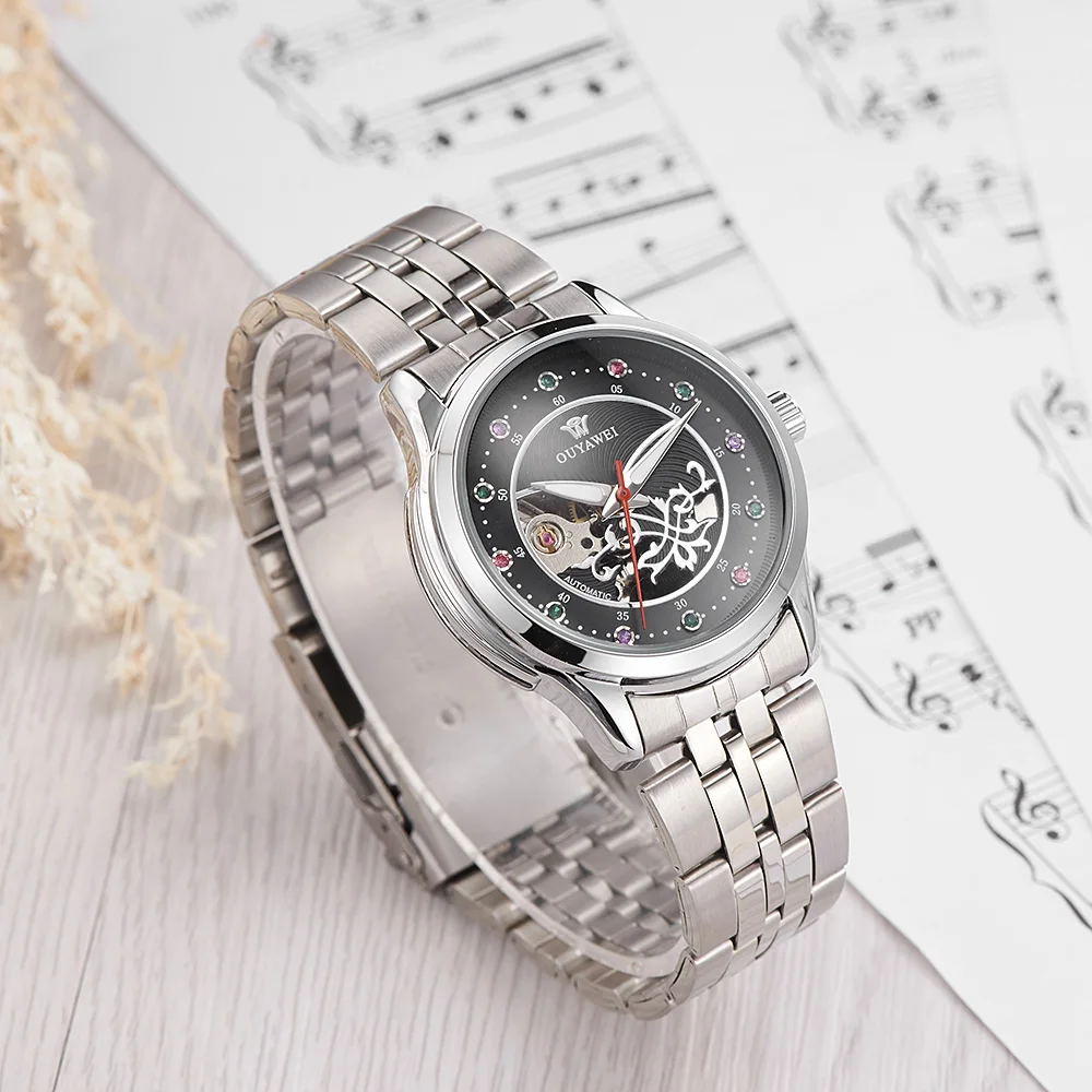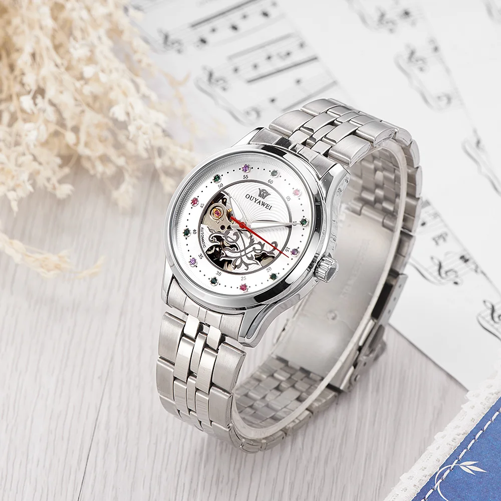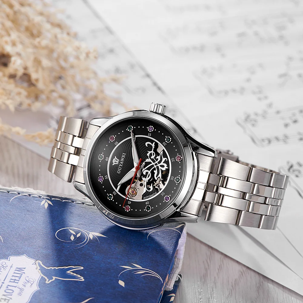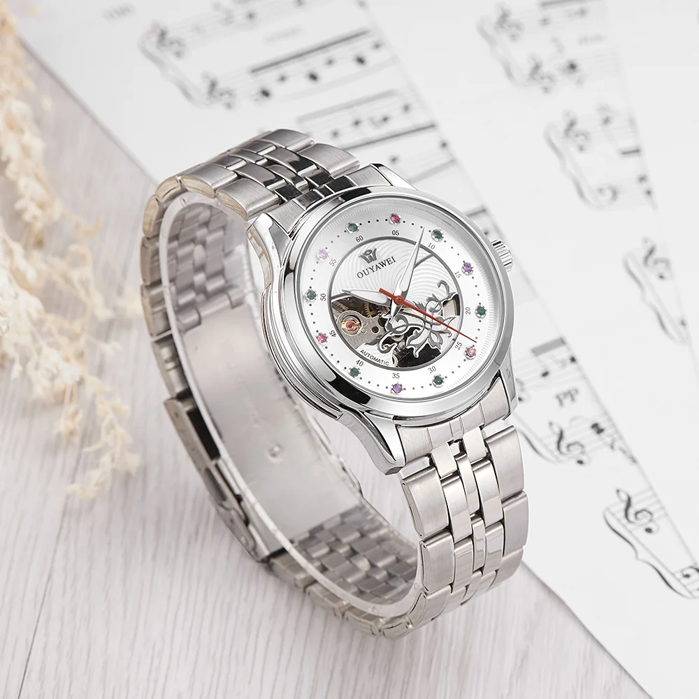 Damen Armbanduhr Skelett Automatik Mechanisch Uhr Kristalle Style
