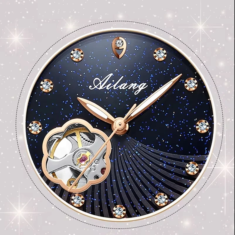 Damen Automatik Uhr Ailang Skeleton Sternenblau Lederarmband 34mm