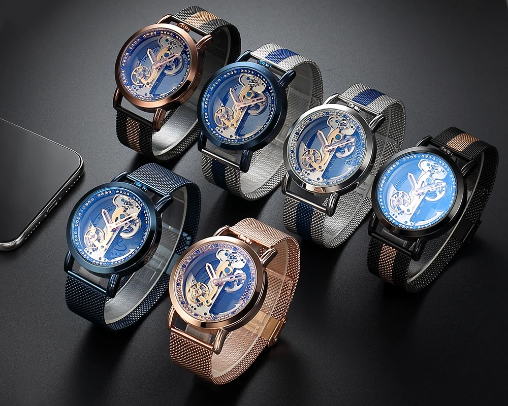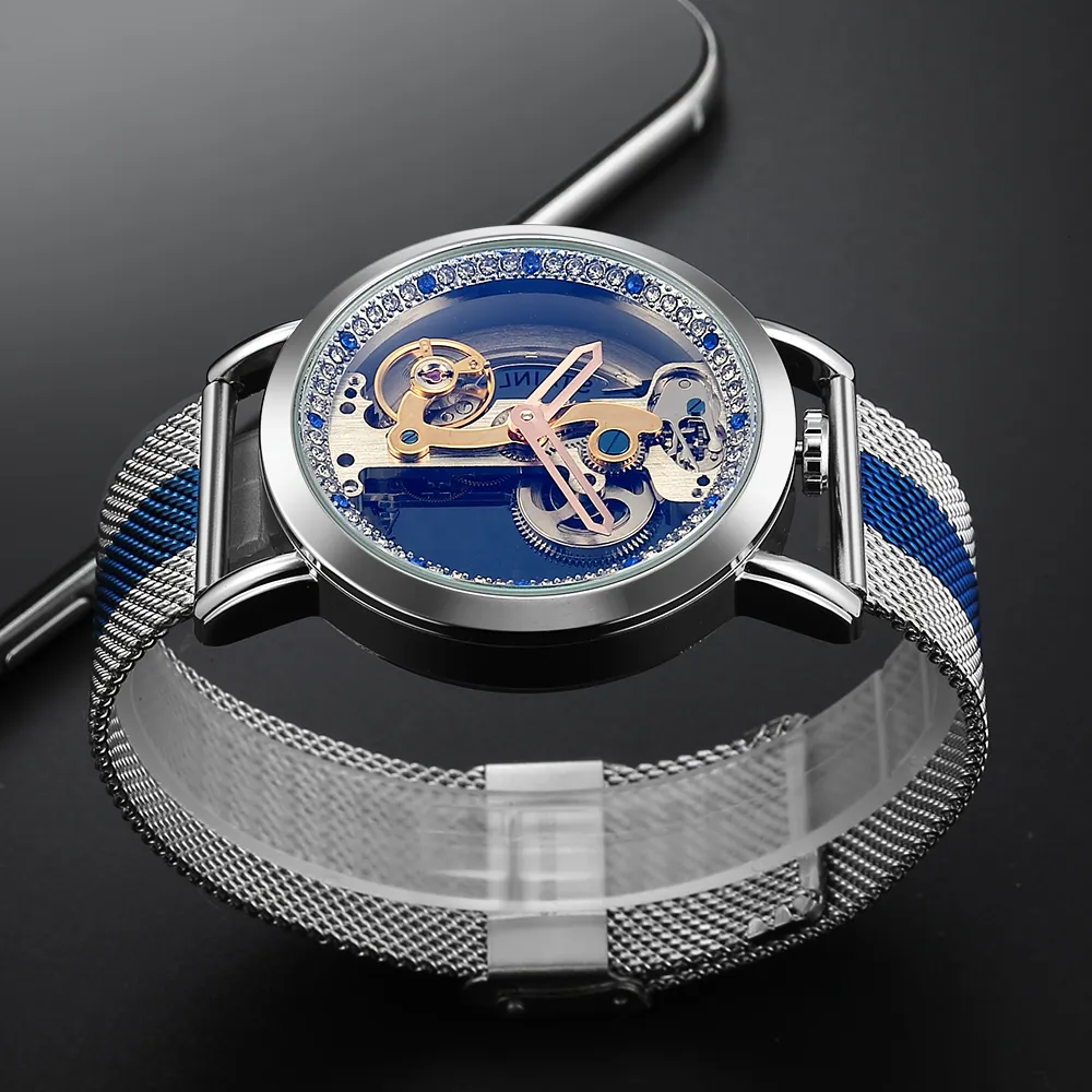 Damen Automatikuhren Uhr Mesh Band Mechanische Uhren Transparent Skelett