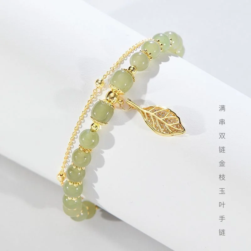 Double Layer Light Green Stone Gold Color Chain Bead Bracelelt For Women New Fashion Leaf Charm Strand Bracelet Daily Wear