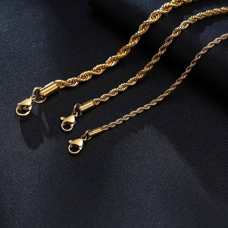 Wähle zwischen den Farben Silber und Gold, kombiniert mit verschiedenen Breiten (2, 3, 4, 5 mm) und zwei verstellbaren Längen. Jede Variante vereint das charakteristische Seilkettendesign mit der präzisen 316L-Gravur.
