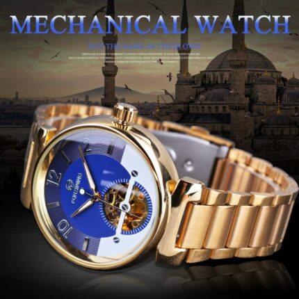 Luxuriöse Forsining Ocean-Uhren mit goldenem Zifferblatt, Skeleton-Anzeige und Edelstahlgehäuse