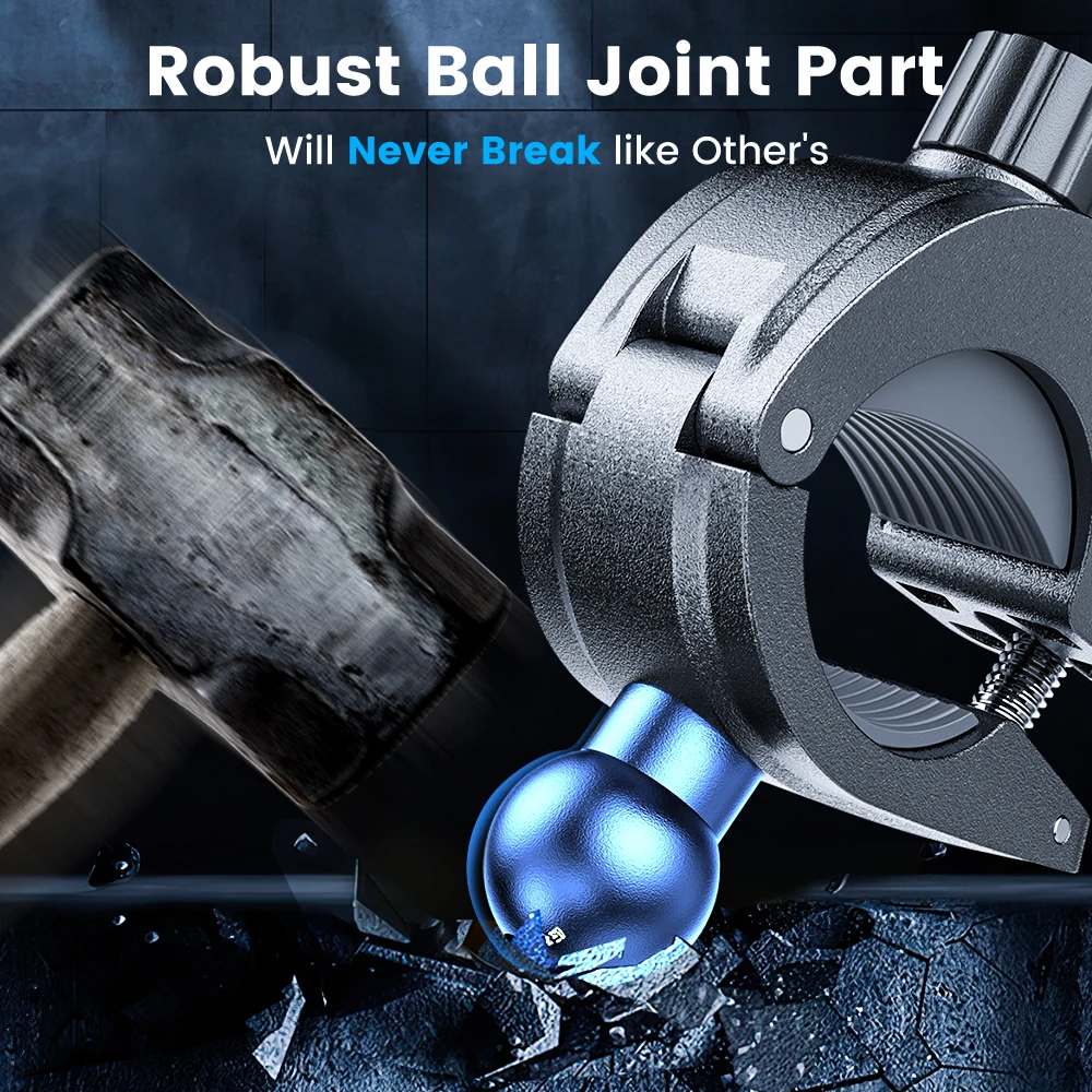 Die Halterung setzt auf eine stabile Klemmkonstruktion mit Kugelgelenk und rutschhemmenden Kontaktflächen für einen verlässlichen Halt am Lenker.