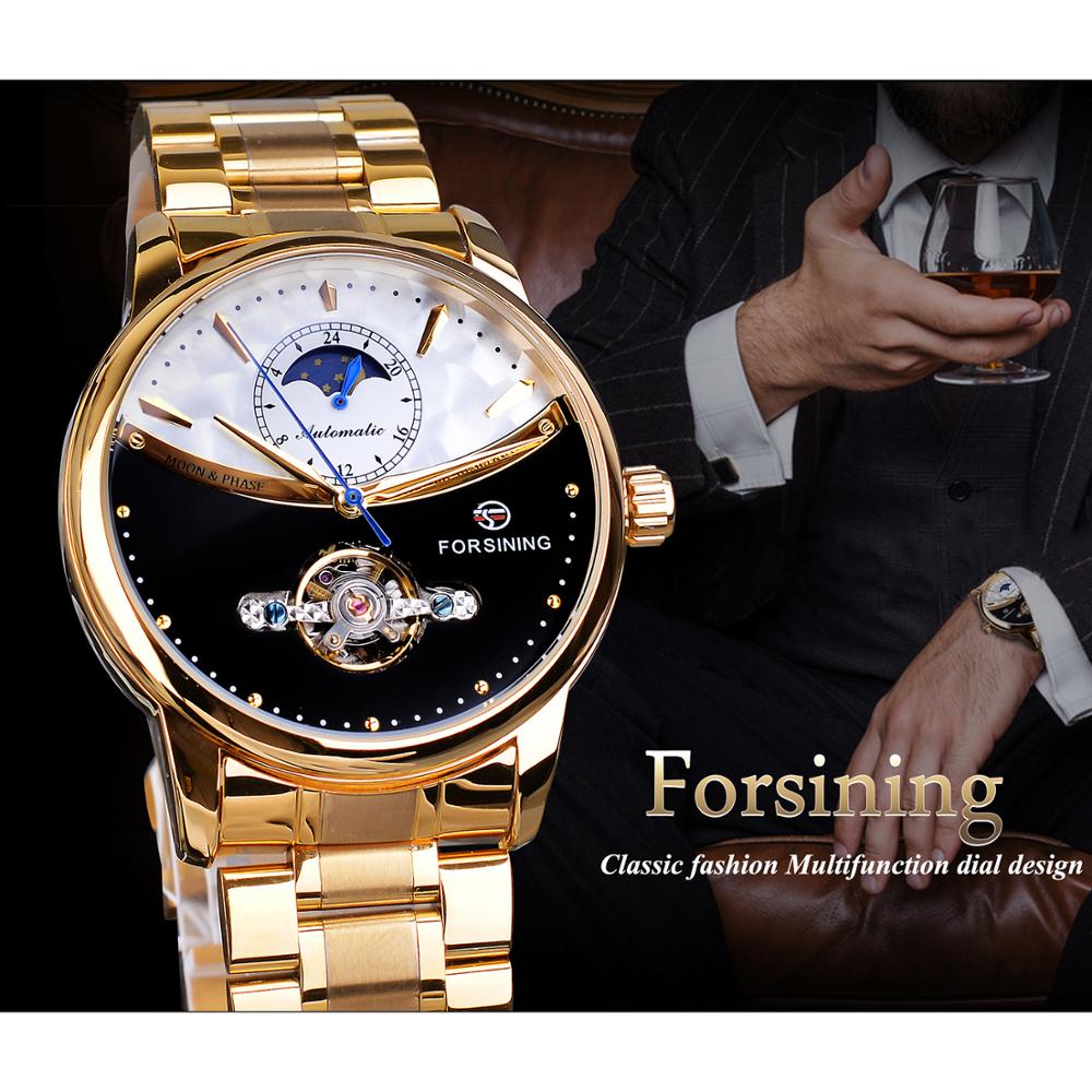 Forsining Herren Automatik Armbanduhr Royal Golden Sun Moon Selbstaufzug Skeleton Edelstahlband Mechanische Uhr
