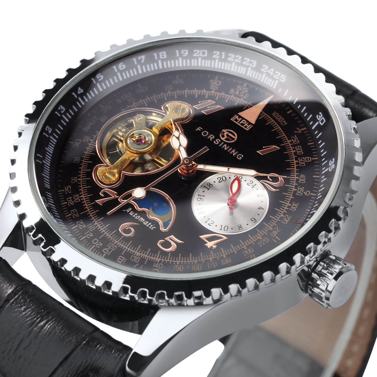Forsining Automatische Mechanische Uhr für Männer Retro Mond Phase Sub-Dials Leder Armband Leucht Männliche Uhren