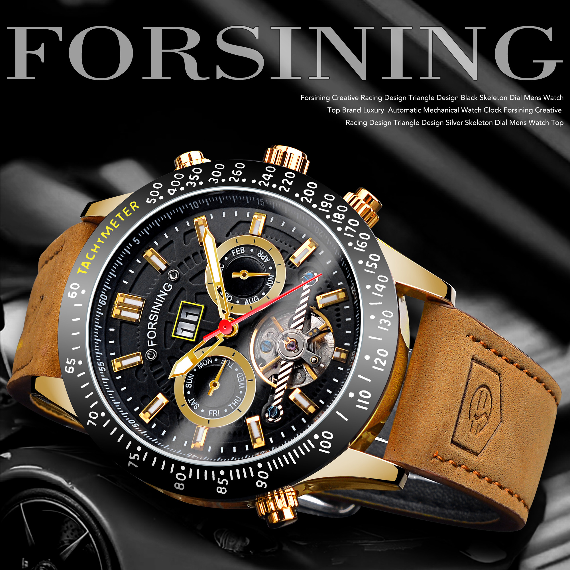 Forsining Chronograph Automatik Herren Militäruhr Hohle mechanische Armbanduhr 3bar Echtes Leder Herren Uhren