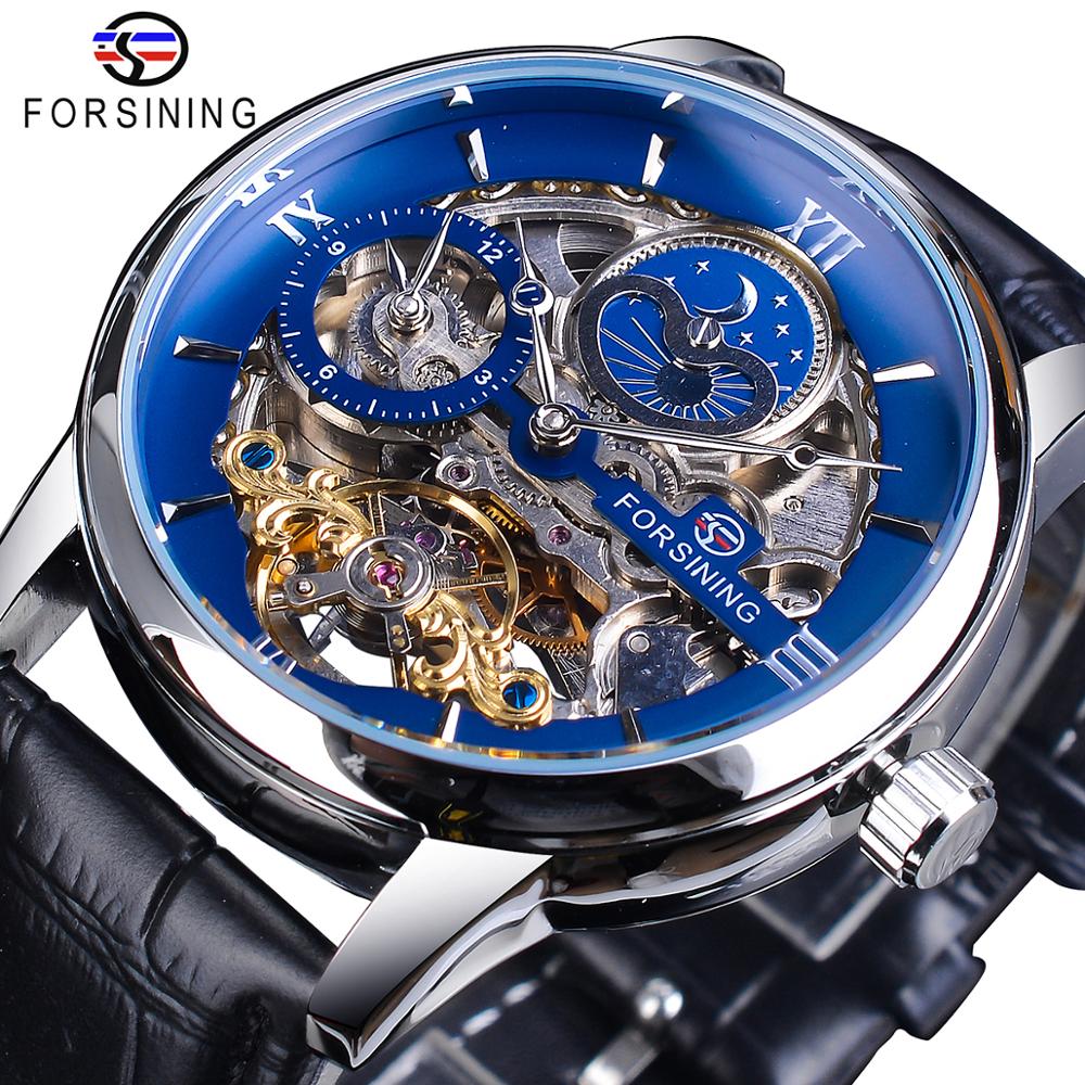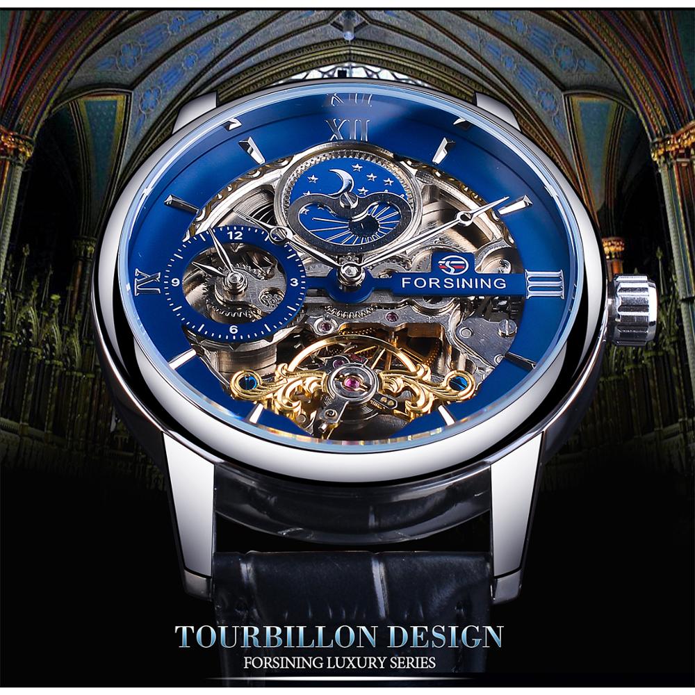 Forsining Automatikuhr Mechanische Uhr Blau Wasserdichtes Lederband Mondphase Luxus Skelett