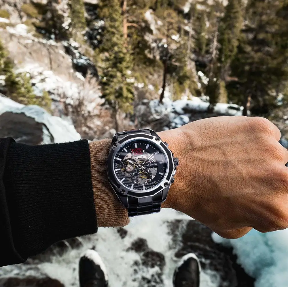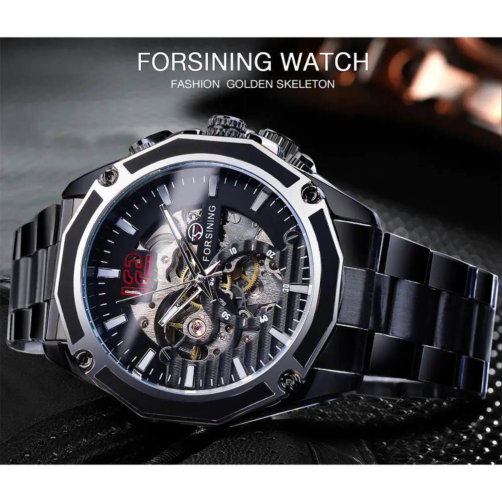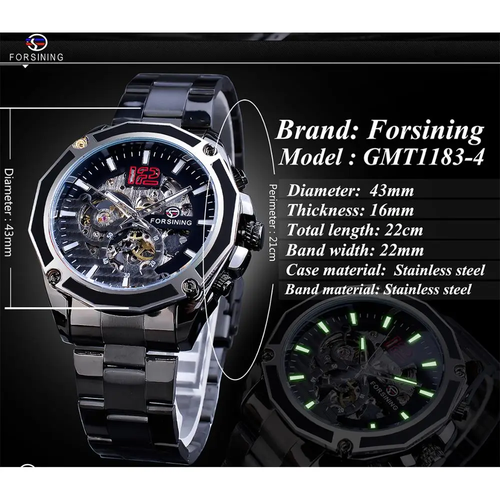 FORSINING GMT1183-4 Automatik Skelettuhr Herren Schwarz Stahl Mesh Skeleton Mechanical Sport Military Luxus