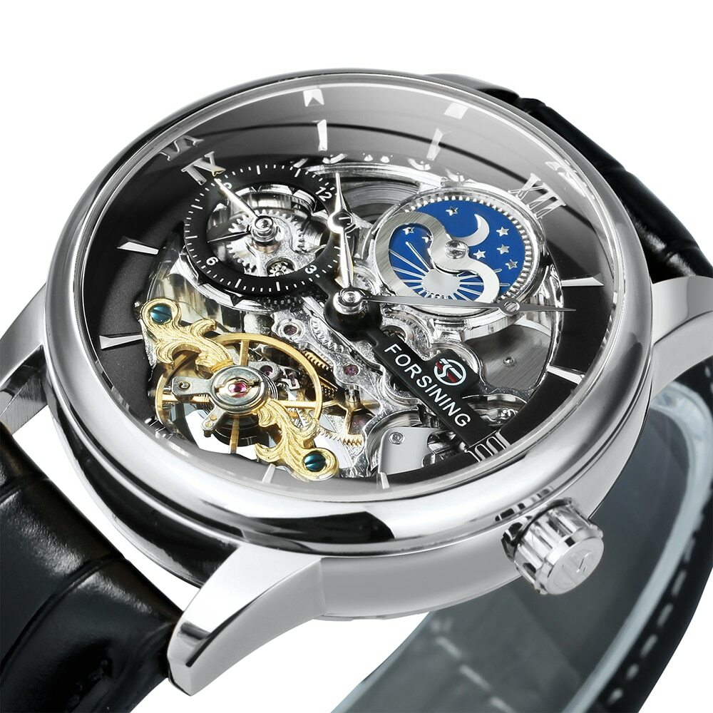 Forsining Klassische Herren Skeleton Uhr Automatische Uhren Herren Top Marke Luxus Lederband Mondphase Mechanische Uhr