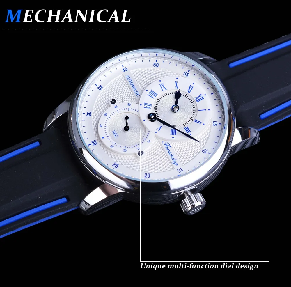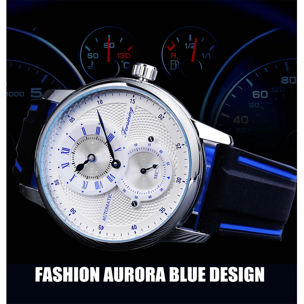 Die Automatikarmbanduhr kombiniert zeitloses Design mit modernen Funktionalitäten. Mit ihrem robusten Edelstahlgehäuse und dem flexiblen Silikonband bietet sie nicht nur einen eleganten Look, sondern auch höchsten Tragekomfort. Die Wasserdichtigkeit sorgt dafür, dass Sie sich keine Sorgen um Spritzwasser machen müssen, während die zwei Zifferblätter Ihnen die Möglichkeit geben, Zeit und Stil gleichzeitig zu messen. Ideal für sportliche Aktivitäten sowie für den Alltag.