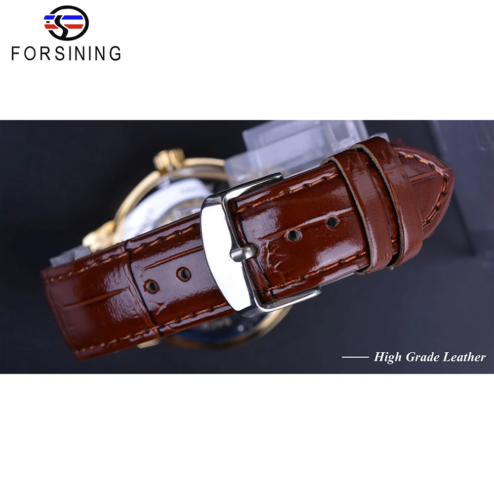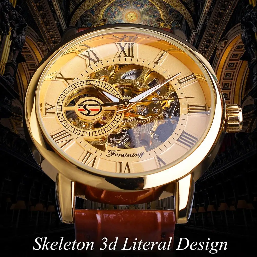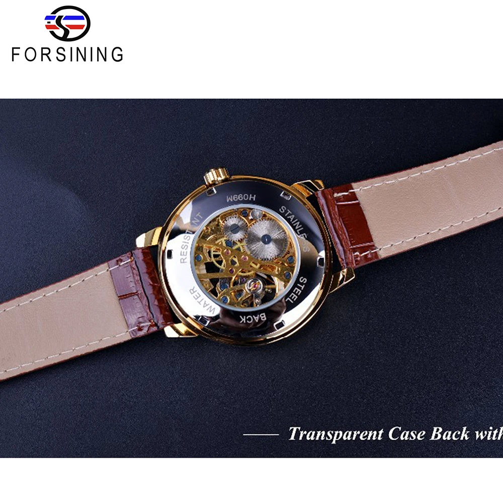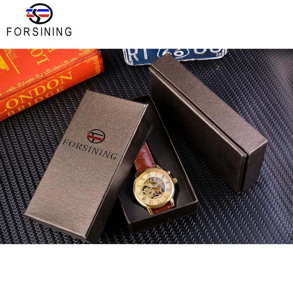 FORSINING Mechanische Skeleton Herrenuhr Gold Römische Ziffern Handaufzug Ultra Dünn Lederarmband Business Dress Gentleman
