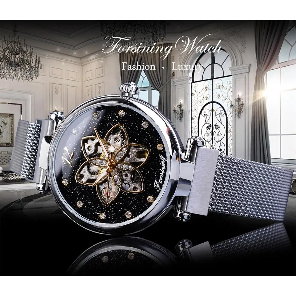 Skelettuhr für Herren Automatik Edelstahl Mesh Dreieckszeiger 40mm 30m