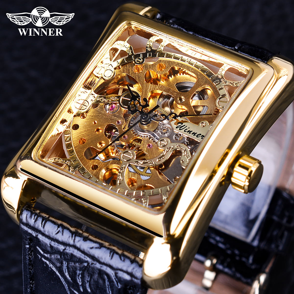 Gewinner Retro Casual Serie Rechteck Zifferblatt Design Goldene Muster Hohl Skeleton Uhr Männer Uhr Marke Luxus Mechanische
