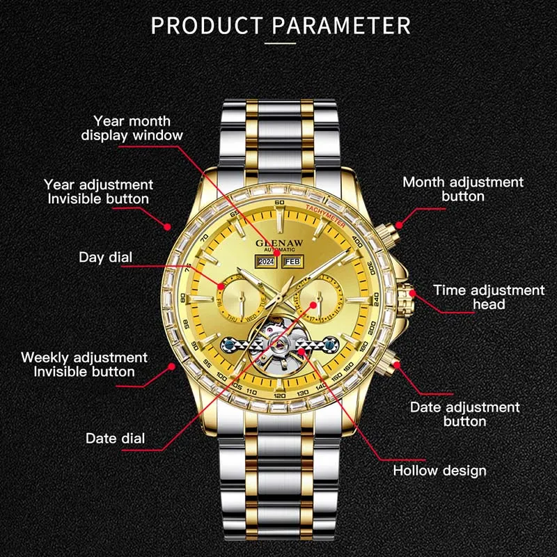 Mechanische Uhr Herren Edelstahl Automatik Multifunktion Kalender Zifferblatt Wasserfest