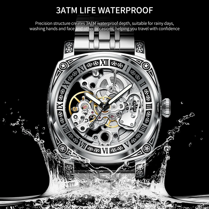 Automatikuhr für Herren Skelettuhr Edelstahl Gummiband 43 mm 30 m Wasserdicht