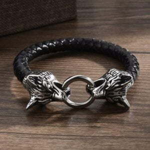 Viking Wolf Head Bracelet Leather Rope Chain Double Wolf Head Bite Ring Bracelet for Men Amulet Viking Jewelry Gift