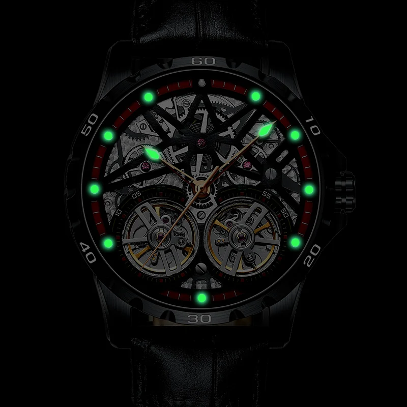 Skelettiertes Zifferblatt mit rubinroten Akzenten