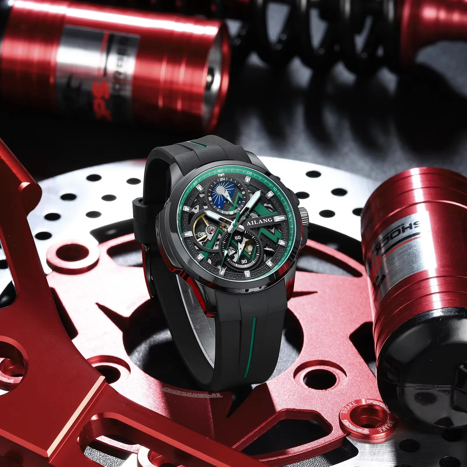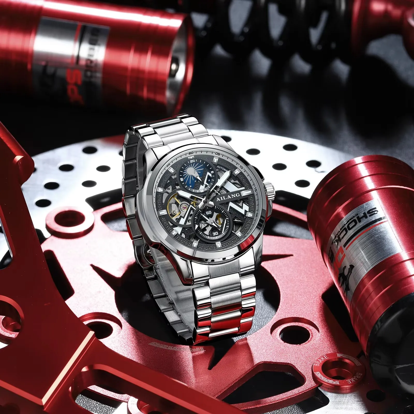 Herren Automatik Uhr Skelett f. AILANG Mondphase Luminova 42mm Schwarz