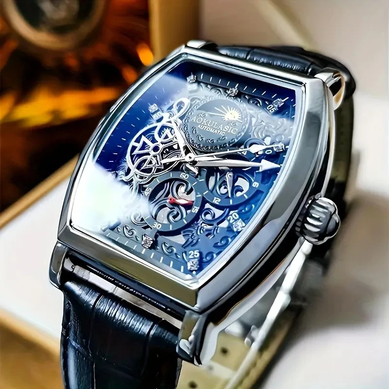 1× Herren‑Automatikuhr im Tonneau‑Design mit Skelett‑Zifferblatt