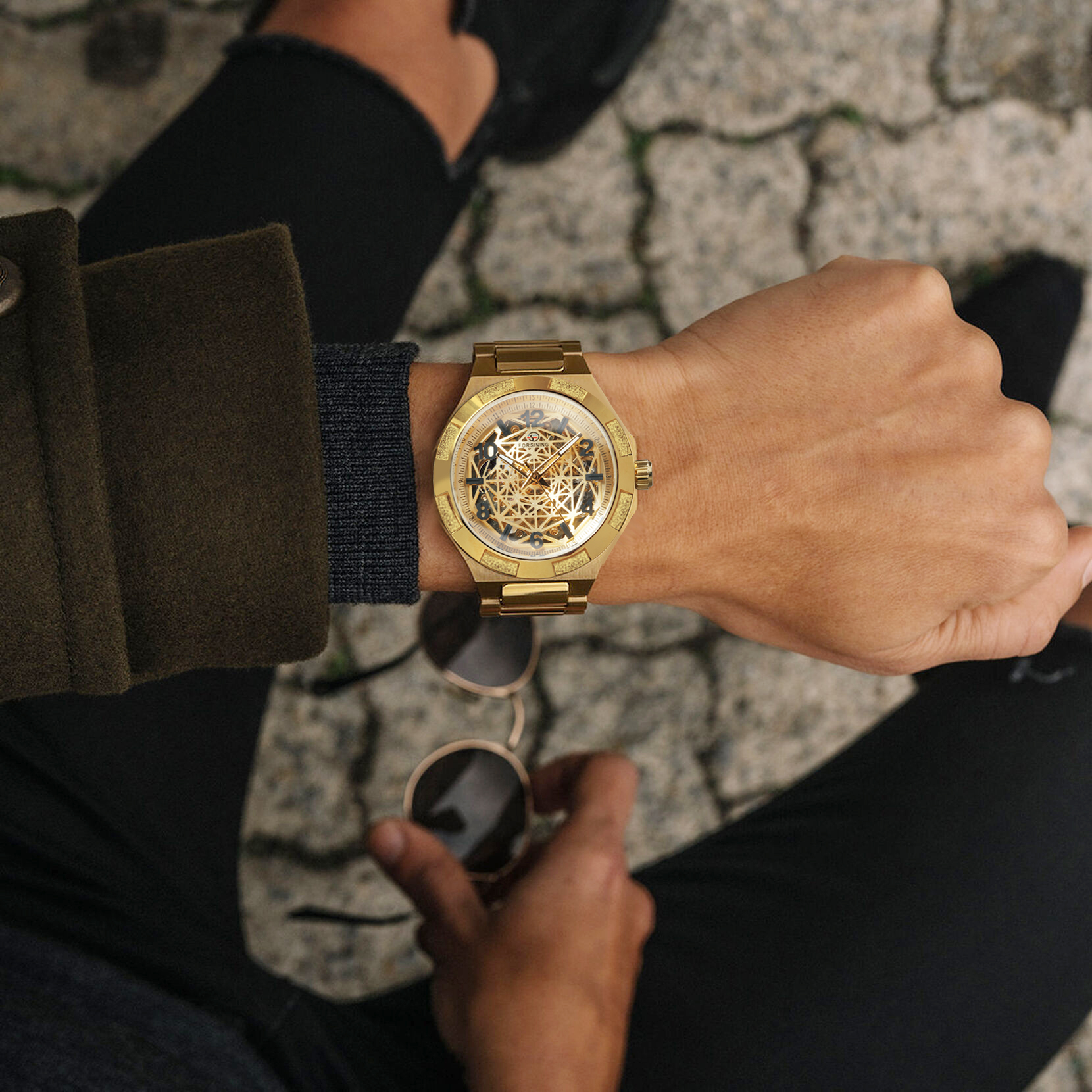 Forsining 2022: Luxuriöse Kalender-Uhr mit Glas-Konkavität und zwei Zifferblättern
