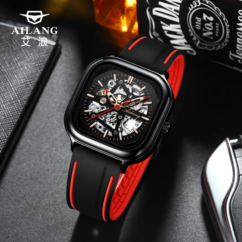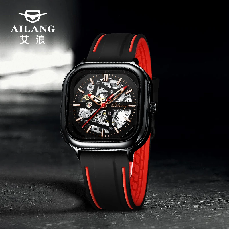 1× AILANG quadratische mechanische Automatikuhr mit Skeleton-Design und Gummi/Silikonarmband (gemäß gewählter Variante im Angebot)