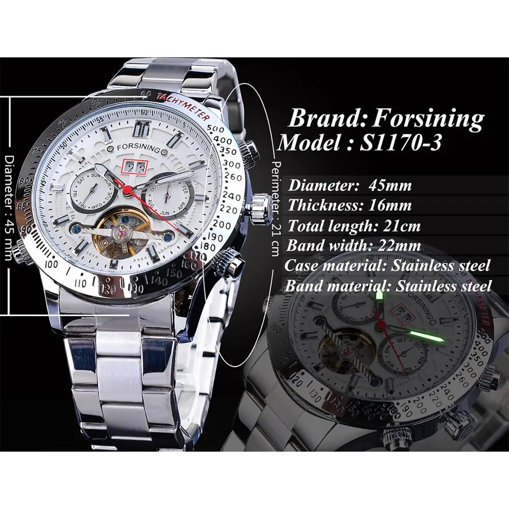 Mit einem Gehäusedurchmesser von ca. 45 mm und einem Edelstahlband von ca. 22 mm Breite setzt die Forsining S1170-3 ein klares Statement, ohne auf Tragekomfort zu verzichten.
