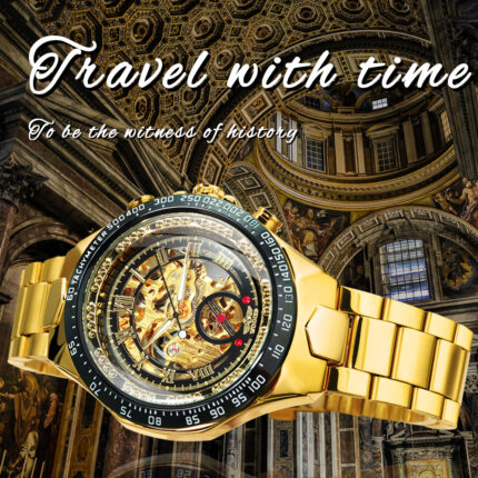 Luxuriöse Edelstahl-Uhr mit Skelett-Zifferblatt, goldenem Uhrwerk und automatischem Aufzug