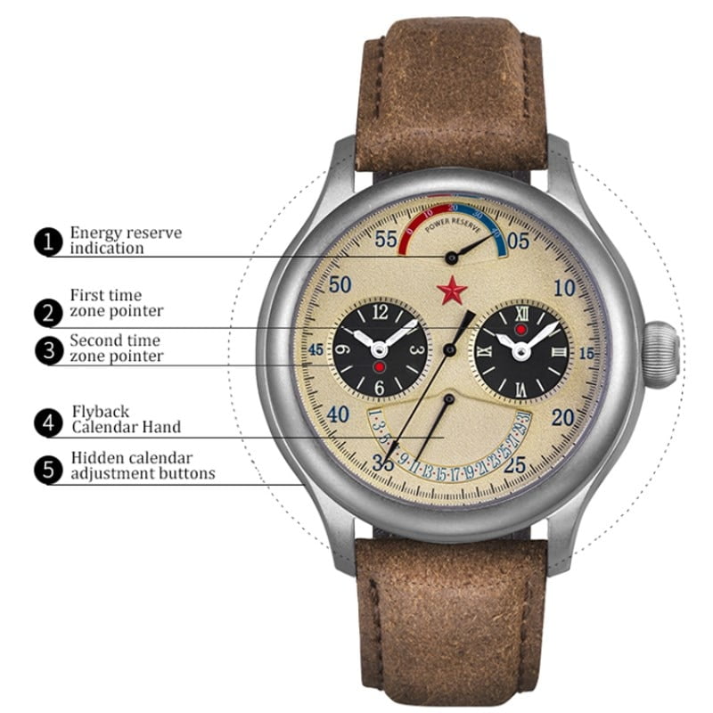 Luminous, Chronograph, Complete Calendar, Multiple Time Zone, Water Resistant, None, luminous hands |