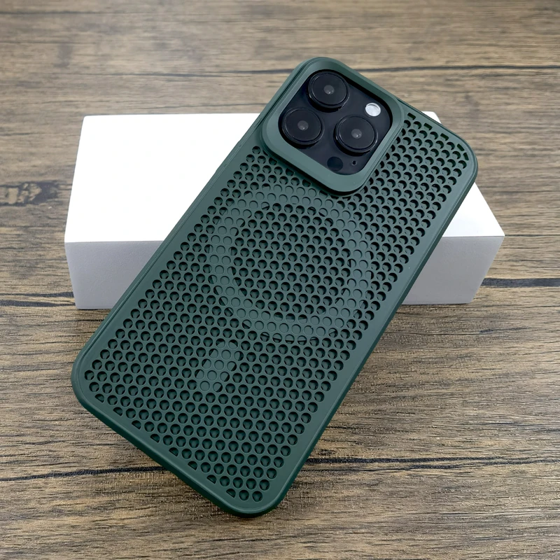 Detailaufnahme der perforierten Rückseite der iPhone MagSafe Hülle für aktive Luftzirkulation.