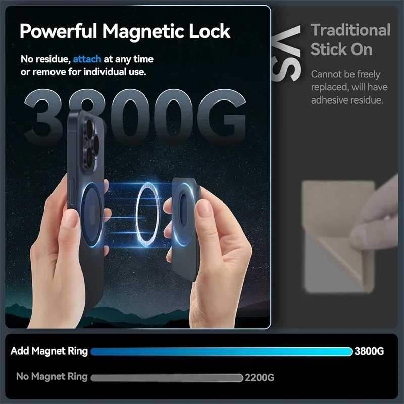3800 G Haftkraft für sicheren Sitz am MagSafe‑iPhone, ohne die schlanke Silhouette zu stören.