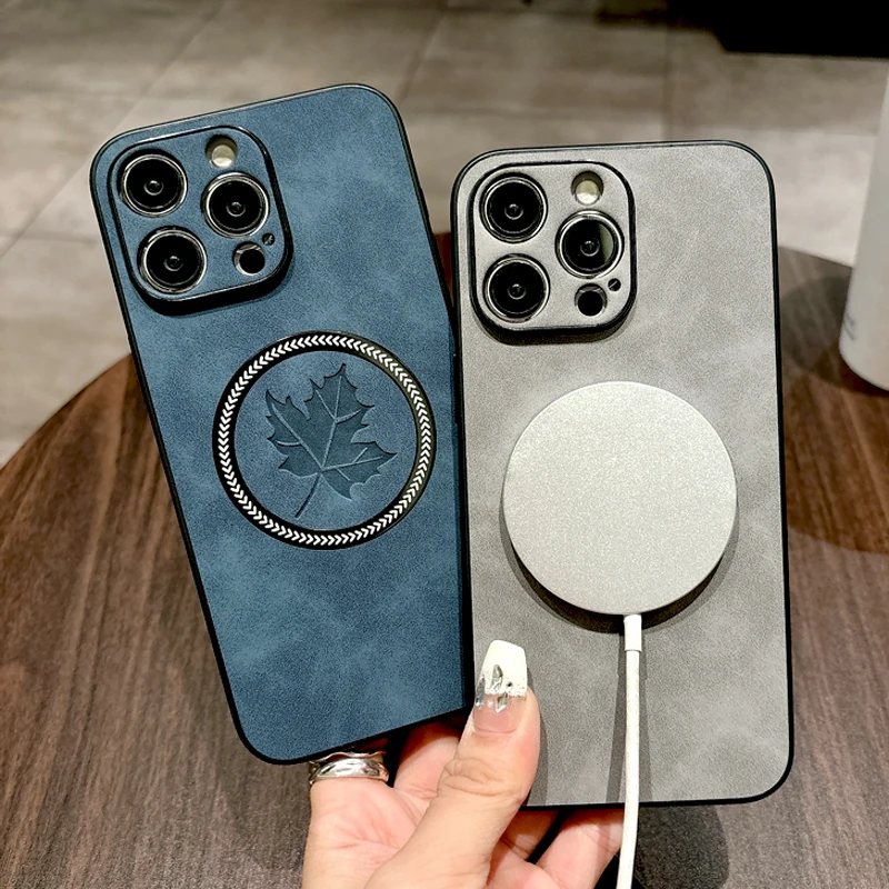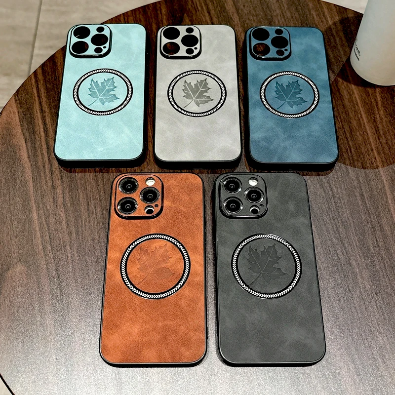 MagSafe Lederoptik Hülle iPhone 12-17 Pro Max Plus Ahornblatt Design
