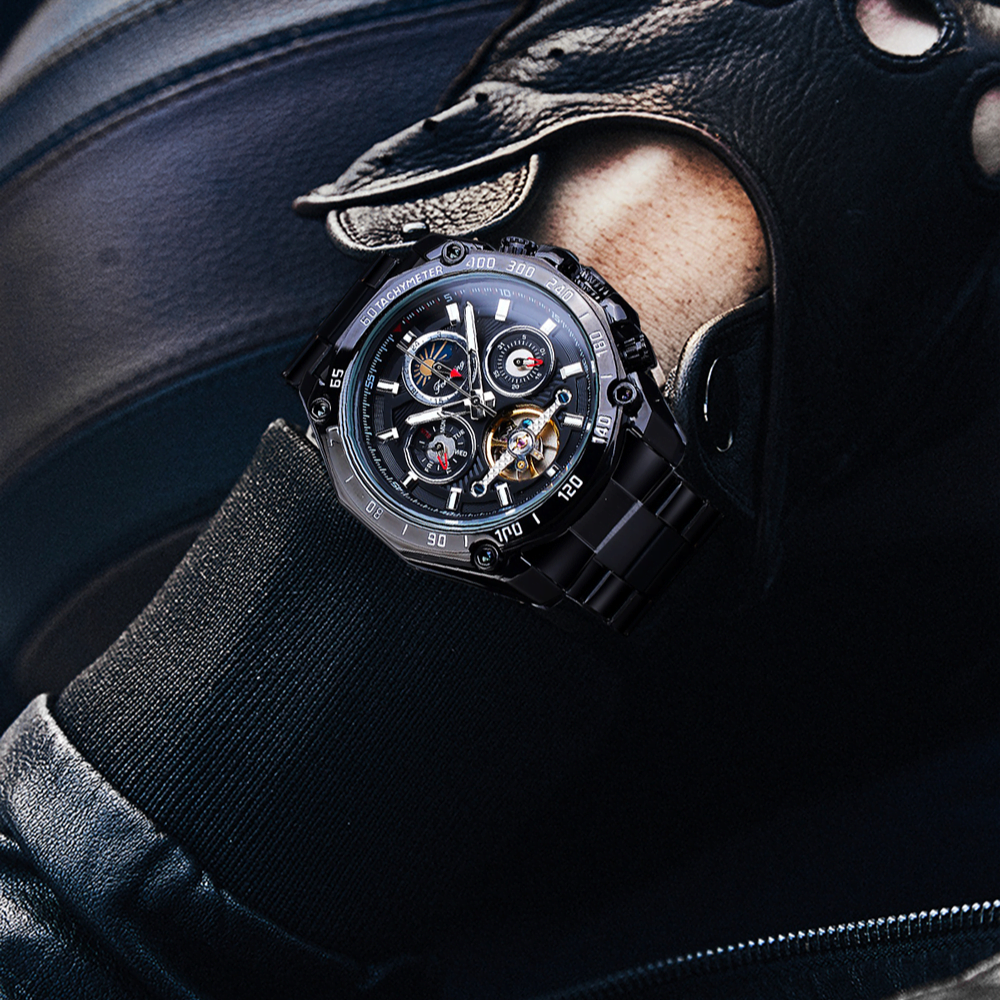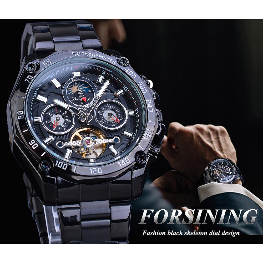 Forsining Marke Schwarz Männlich Mechanische Uhren Automatische Multifunktions Mondphase Datum Racing Sport Stahlband