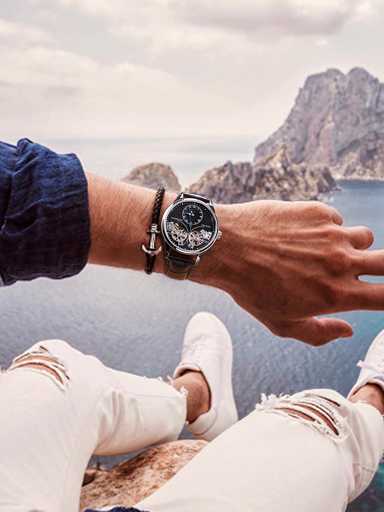 Herren hohle automatische Bewegung Watch Mechanische Luxus Uhr Doppelpendel Schwungrad Herren Uhr