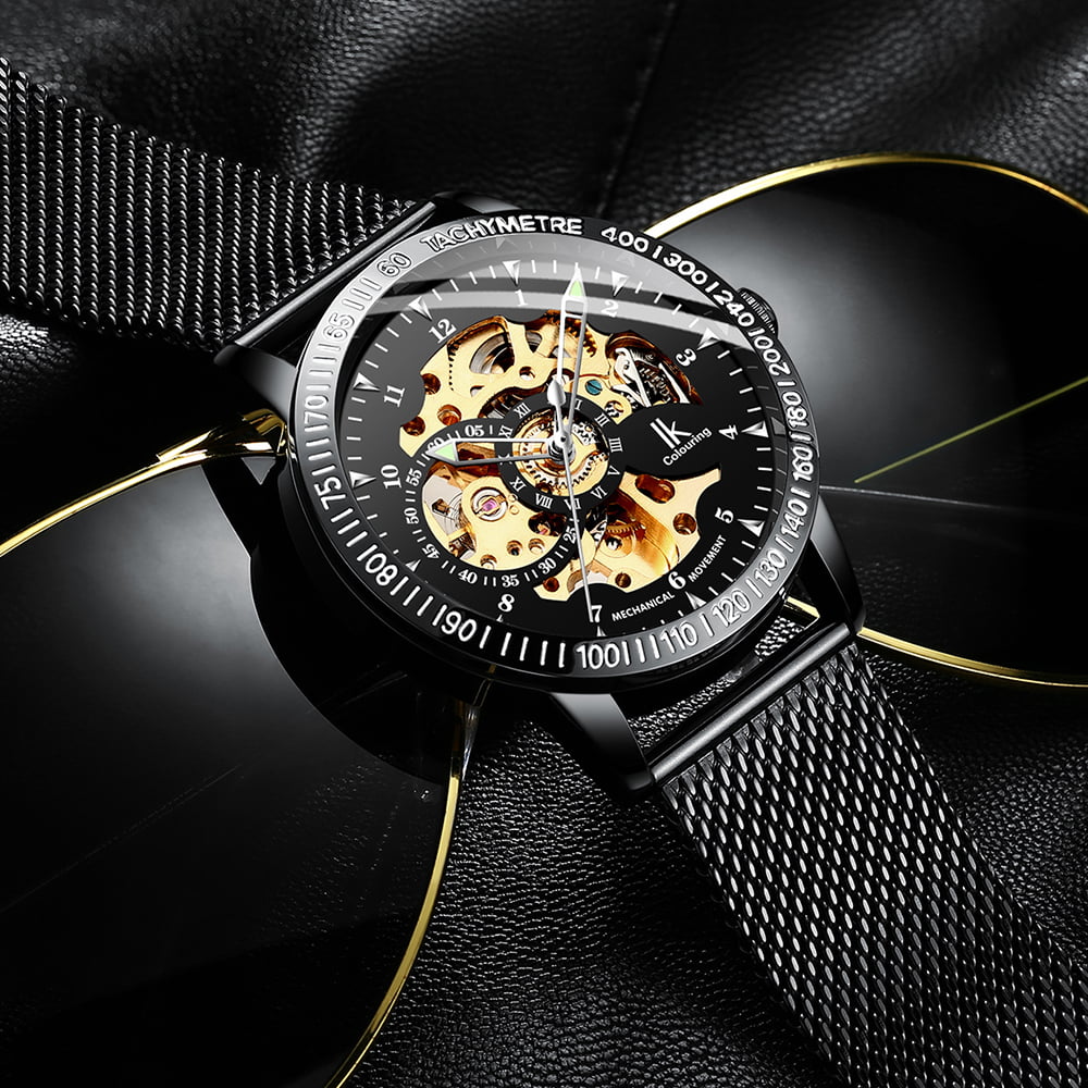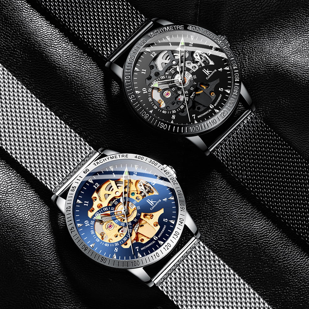 This IK Colouring Stainless Steel Men’s Watch is a full skeleton round dial with Roman numerals, the eye-catching silver movement presents exquisite craftsmanship, and the simple retro design shows your gentlemanly demeanor. The stainless steel mesh strap is very comfortable to wear on the wrist. It is equipped with a strap adjuster. You can easily adjust the length of the strap or replace it with a DIY band that you liked.