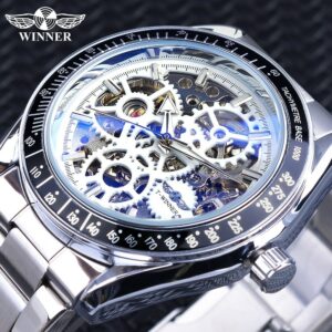 Herrenuhr Steampunk Skelettdesign Silber Edelstahl Automatik Leuchtzeiger