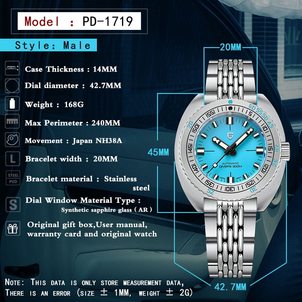 Das Uhrwerk des PD-1719 ist ein Japan NH38a automatisches mechanisches Uhrwerk, das automatisch oder manuell aufgezogen werden kann und eine Gangreserve von 168 Stunden hat. Die Uhr ist bis zu einer Wassertiefe von 300 Metern (30 bar) wasserdicht, was sie zum Schwimmen und Tauchen geeignet macht, aber nicht für heiße Quellen. Zusätzlich verfügt das Gehäuse über eine spiralförmige Krone, um die Wasserdichtigkeit zu verbessern. Der drehbare Lünettenring dient zur Zeitmessung.