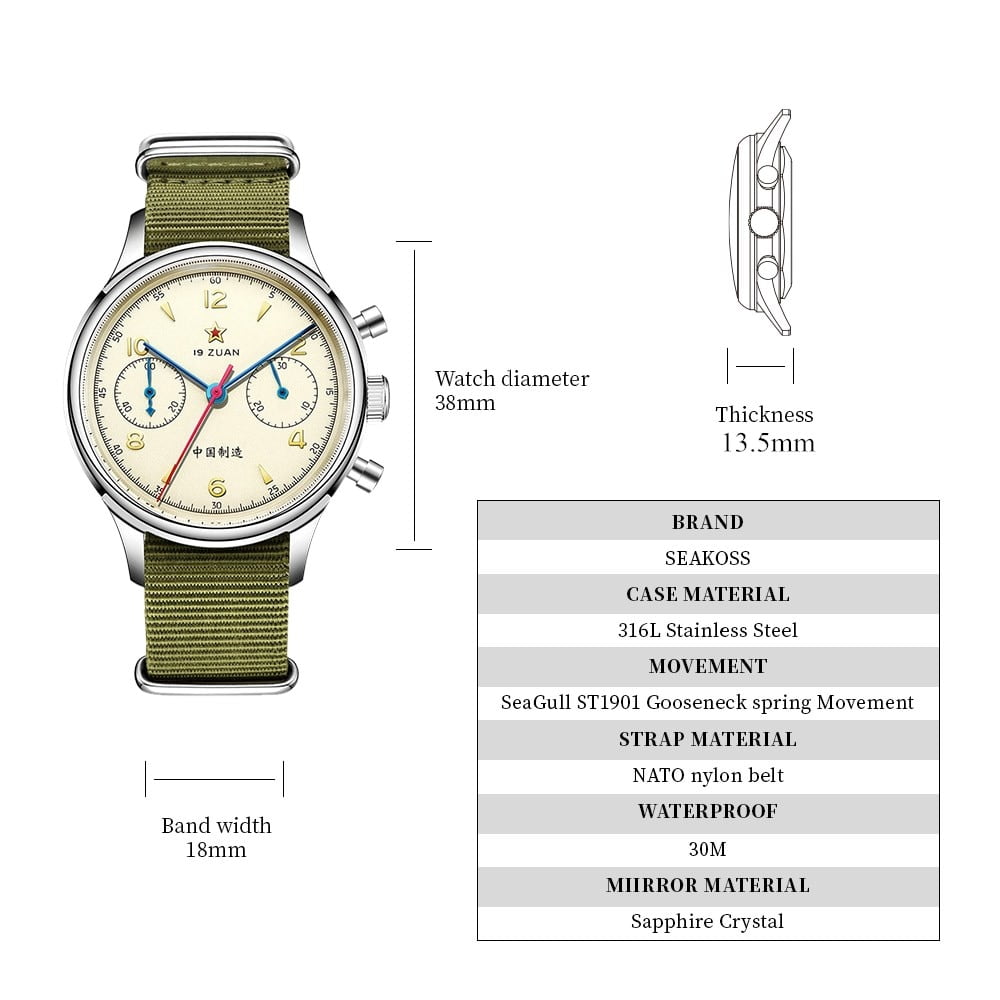 Die Pilot Chronograph Mechanical Watches bieten mehrere Vorteile, einschließlich Präzision und Langlebigkeit. Mit einer Schlagzahl von 21600, einem Durchmesser von 38mm oder 40mm und einer Dicke von 13,5mm sind diese Uhren so konzipiert, dass sie bequem an Ihrem Handgelenk sitzen und gleichzeitig eine genaue Zeitmessung bieten. Die Gangreserve von 40 Stunden sorgt dafür, dass Sie sich keine Sorgen machen müssen, die Uhr ständig aufzuziehen. Die Dornschließe verleiht der Uhr einen klassischen Touch, während das Zifferblattfenster aus Saphirglas oder Acrylglas das Zifferblatt vor Kratzern und Beschädigungen schützt.