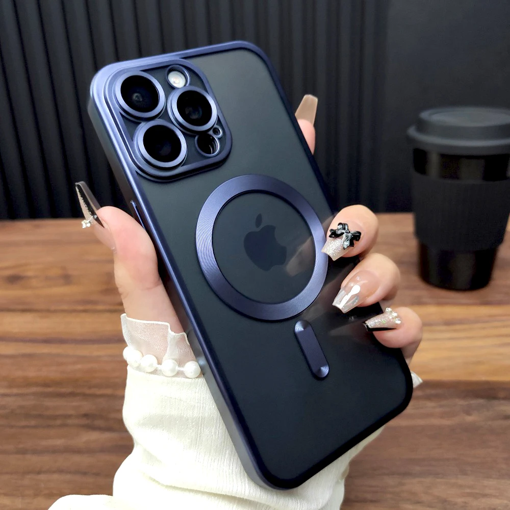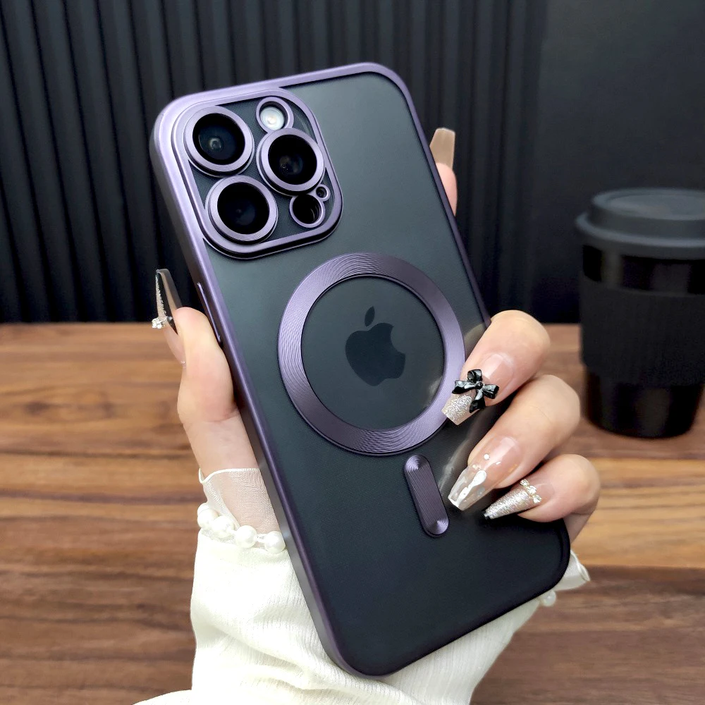 Kontrastierende Akzentrahmen heben Kamera und Magnetring hervor — persönlicher Stil ohne Kompromiss beim Schutz oder der Funktion.