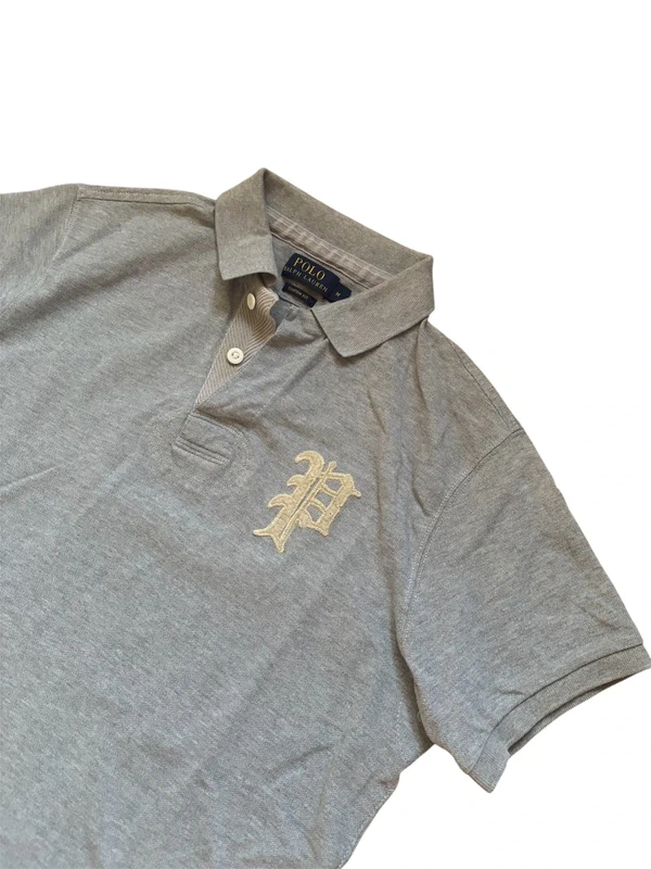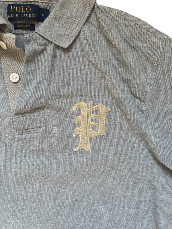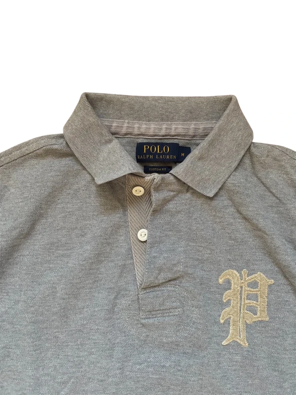 Ralph Lauren Custom Fit Polo M Grau Heather Big P Varsity Patch College Style VNTG