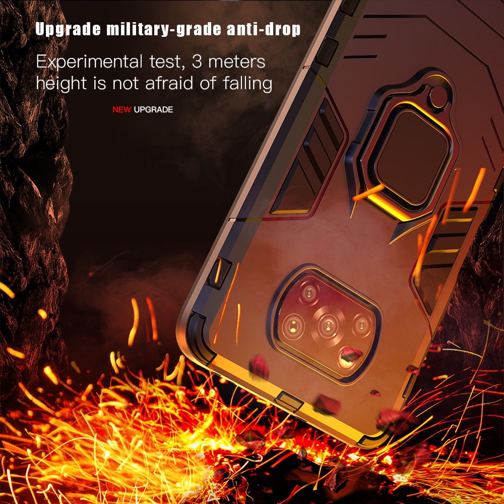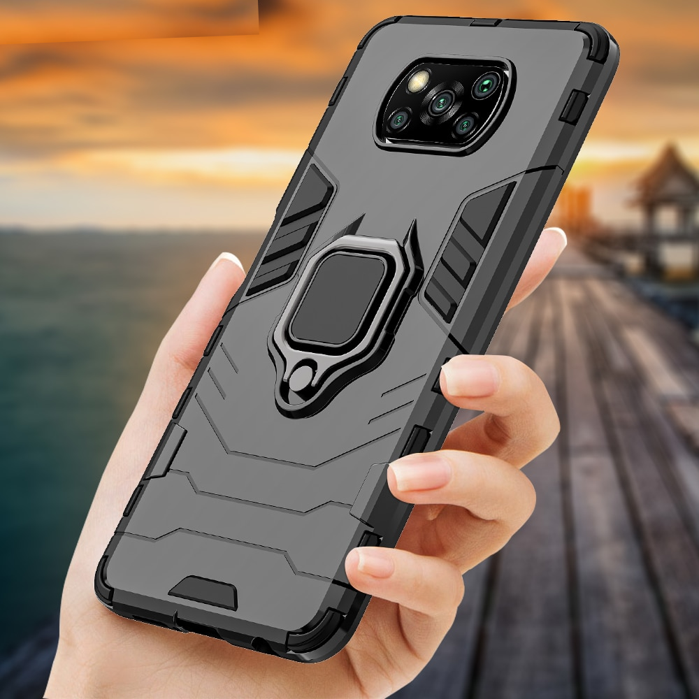 Dies ist ein stoßfestes Rüstungsgehäuse, das für das Xiaomi POCO X3 NFC, F2 Pro und Pocophone X3 NFC, X2 und F1 entwickelt wurde. Es verfügt über einen Ringständer und eine Stoßstange für zusätzlichen Schutz und dient als Rückabdeckung des Telefons. Das Gehäuse ist so konzipiert, dass es vor Stößen und Erschütterungen schützt.