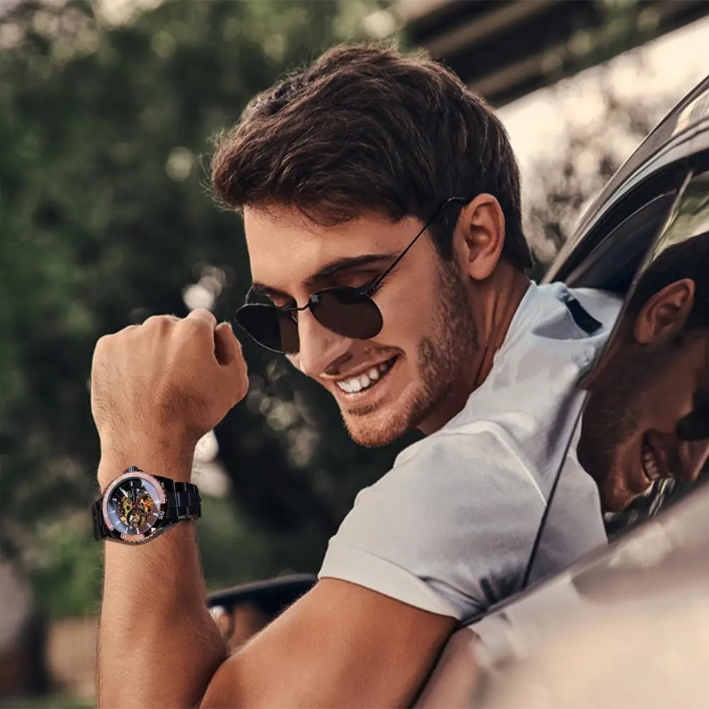 Mechanische Skeleton Uhr Edelstahl Sportuhr Leuchtende Hände Transparent Armband für Männer
