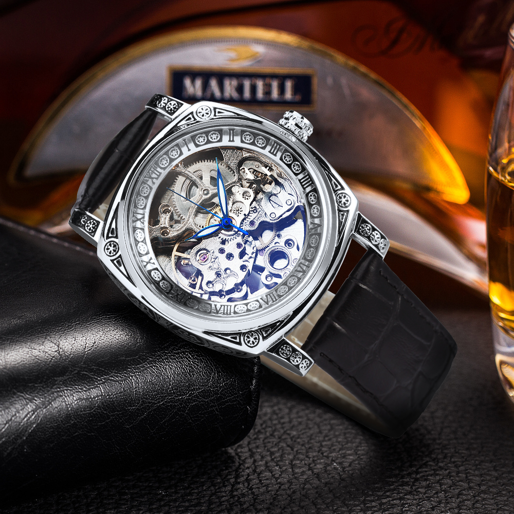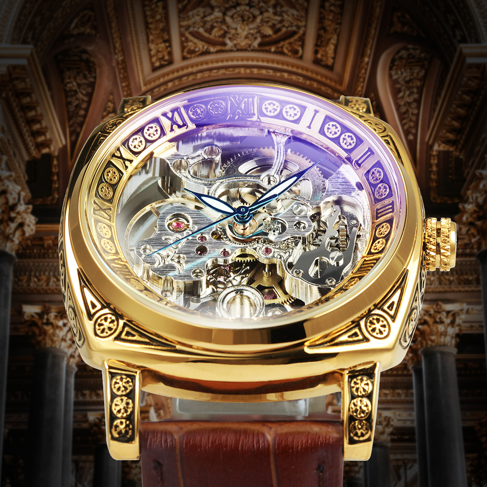 Skelettuhr für Männer Mechanische Armbanduhren Goldenes graviertes Gehäuse Lederband Leuchtend